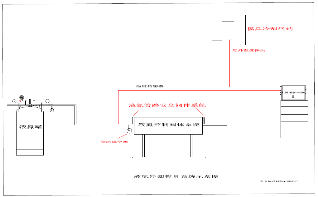 控制系统主要由液氮输送管路、控制阀体、温度监控、自动旁通、安全系统等一整套系统整合的自动控制系统组成。液氮输送管路负责从液氮罐体输送液氮到控制系统阀体,再输送到铝模具端液氮套装内部。整体系统运行由控制系统来运作。
